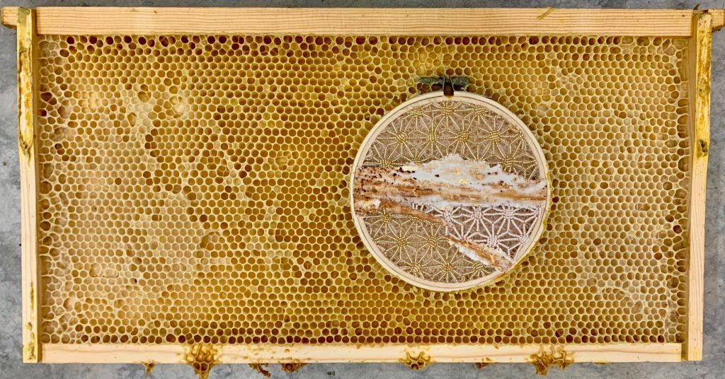 Et Roth s’est associé avec ses abeilles domestiques pour créer des collages de différents médias associant broderie, perlage, tissu, écorce d’arbre et nid d’abeille. L’artiste établie à Toronto construit des œuvres d’art à l’intérieur des cadres, et les abeilles les complètent en les recouvrant de motifs en nid d’abeilles organiques.