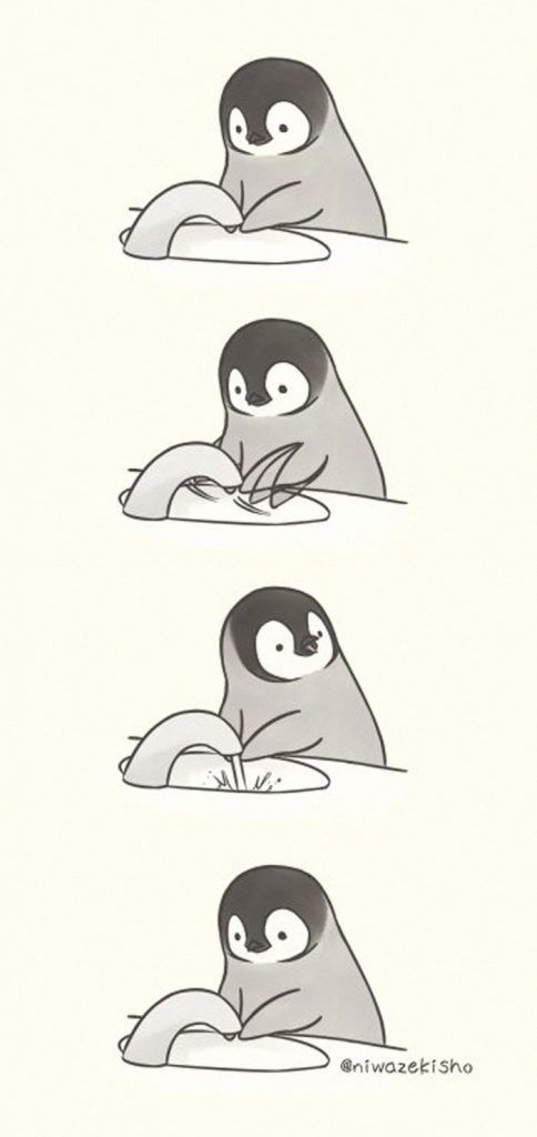 « La raison pour laquelle je dessine surtout des manchots, c’est qu’ils sont plus faciles à rendre amusant que les autres oiseaux. Et les poussins de l’empereur sont l’une des créatures les plus mignonnes du monde! »