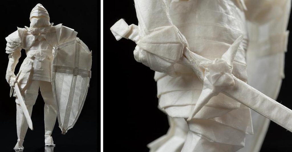 D’une hauteur de 18 centimètres, la figurine portant une épée et un bouclier a demandé 41 heures de travail en utilisant des techniques d’origami humides et sèches.