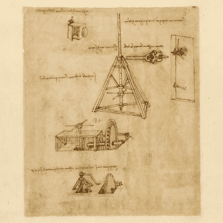 Le Codex Atlanticus est la plus grande collection de papiers Da Vinci et couvre toute sa carrière. Cela commence en 1478 (quand il travaillait dans sa ville natale de Toscane) à 1519 (quand il mourut en France). Le nom Atlanticus vient du fait que Da Vinci utilisait de grandes feuilles, similaires à celles utilisées pour les atlas géographiques. Le codex présente des croquis et des diagrammes pour ses inventions créatives telles que les parachutes, les machines de guerre et les pompes hydrauliques. Il présente également ses esquisses architecturales détaillées et ses études d’anatomie.