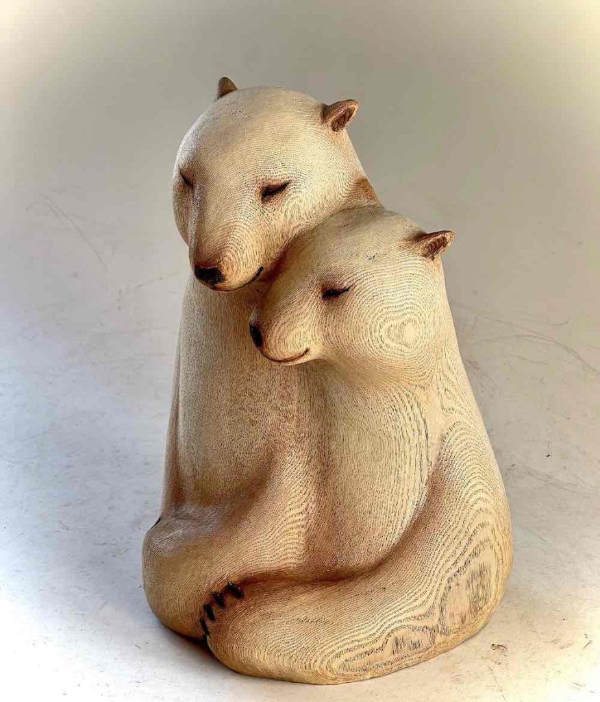 Des oreilles d’un lapin à l’étreinte douillette des ours polaires, Nikichi évoque les nuances émotionnelles de l’intimité, de la solitude et du recueillement dans ses sculptures délicatement sculptées. Le grain du bois soigneusement utilisé façonne les genoux et les joues, les pattes se serrent ensemble au repos et des invités ailés se perchent sur des nez délicatement taillés.