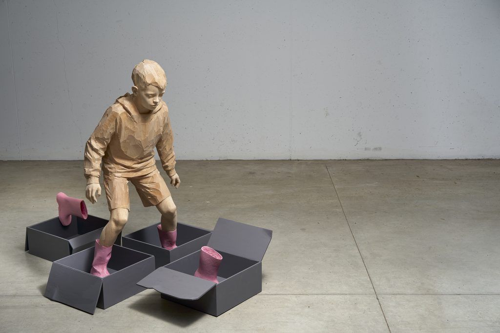 Des grappes de sphères en bois jaillissent du bout des doigts et du corps des enfants dans les sculptures poétiques de Willy Verginer . L’artiste italien assemble des sculptures réalistes de personnages adolescents avec des éléments de fantaisie et d’imagination. A côté des formes évoquant les jeux de l’enfance se trouvent d’épaisses bandes de peinture monochromatique qui s’enroulent autour des sculptures et les coupent en deux dans des lieux insolites.
