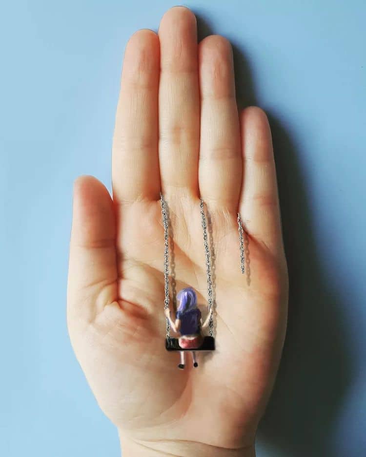 Golsa Golchini utilise sa main comme toile pour des peintures avec de minuscules scènes utilise le caractère non conventionnel de sa toile à l’avantage de l’idée. En fait, nombre de ses compositions originales prennent vie dans la façon dont elles interagissent avec son anatomie. Par exemple, en une seule scène, l’artiste peint autour de deux de ses doigts pour donner l’impression d’une paire de jambes. Dans un autre exemple, elle ajoute une minuscule chaîne en argent autour de son majeur pour suspendre une balançoire occupée par une fille aux cheveux bleus.