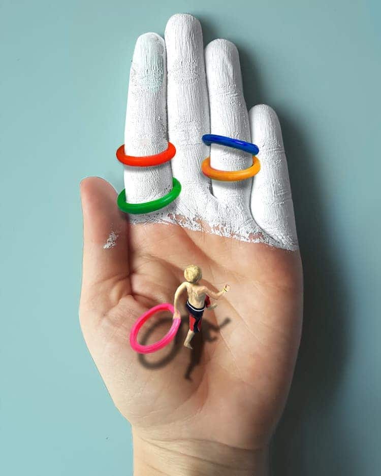 Sa dernière idée consiste à transformer sa propre main en une œuvre d’art. Chaque oeuvre montre des interprétations réalistes de figurines miniatures, d’animaux, d’objets et d’environnements couvrant ses doigts, sa paume et son poignet.