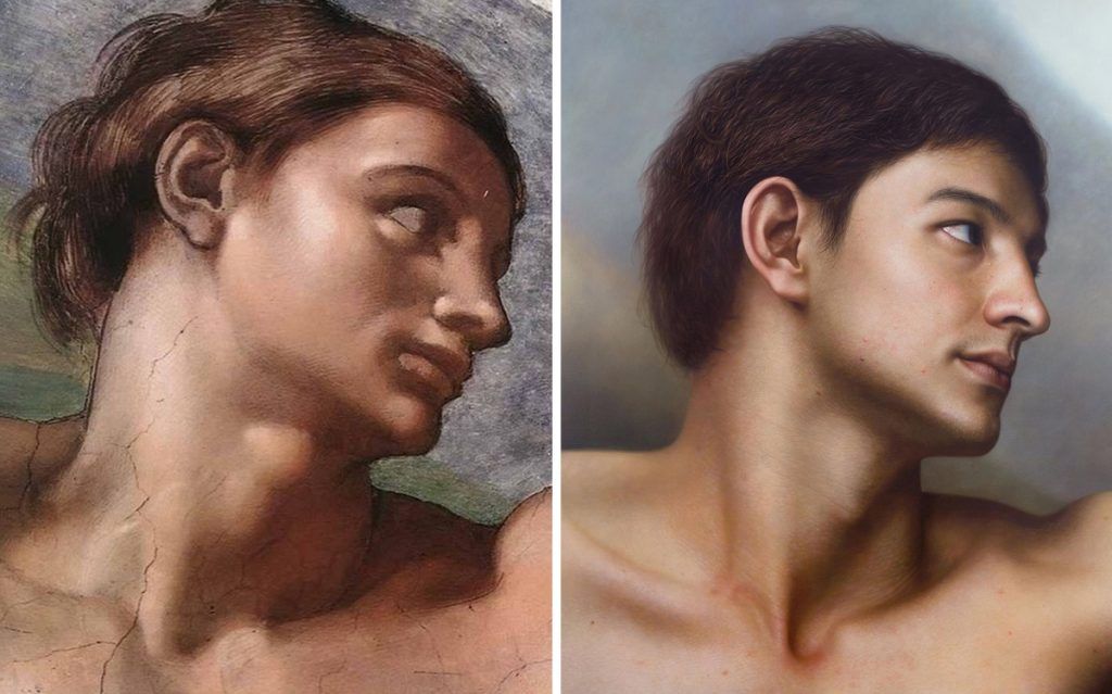 L’artiste Joongwon Jeong ajoute une touche hyperréaliste à des œuvres d’art emblématiques et à des personnages célèbres du passé. Il a apporté une nouvelle vie, par exemple, au dieu de Michel-Ange et à Adam, apparue sur la célèbre fresque de la chapelle Sixtine en Italie à Rome. Les deux sujets, réinventés par le savoir-faire magistral de Jeong en matière de peinture, semblent être des photographies. Ils présentent de fines rides et taches solaires sur la peau et des cheveux dans lesquels vous pourriez faire passer vos doigts.