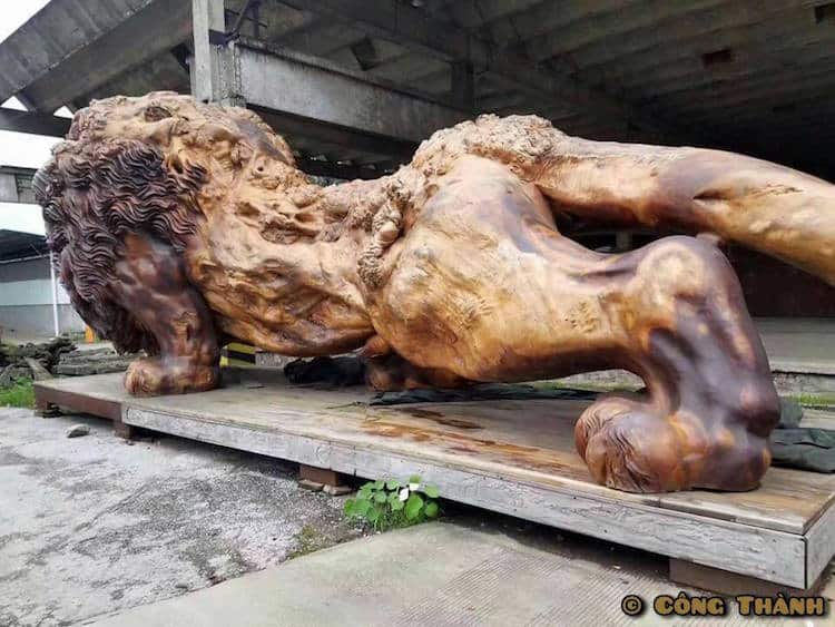 Avec une équipe de 20 personnes et 3 ans de travail, un seul tronc d’arbre a été sculpté en un lion géant intitulé Lion oriental .