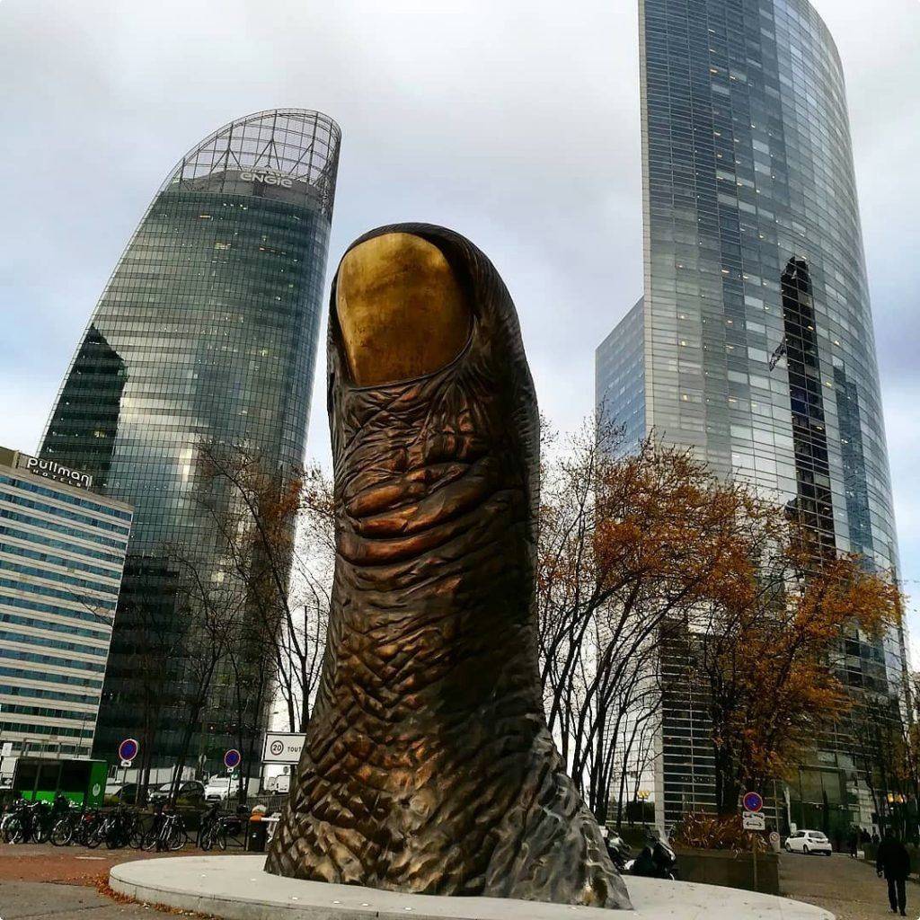 Le Pouce, une sculpture hyper-réaliste de César Baldaccini représentant un pouce géant sortant du sol, a été installée à Paris. Elle mesure 12 mètres de haut et pèse plus de 18 tonnes.