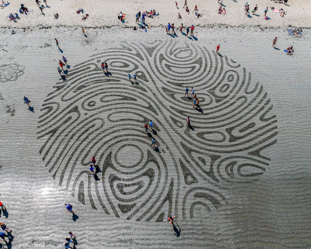 Ses motifs vont des dessins géométriques aux mandalas en passant par les courants aquatiques – qui disparaissent tous lorsque les vagues reviennent sur le rivage. Alors que sa pratique de l’art environnemental a commencé dans le nord de la Californie, il crée maintenant ses œuvres d’art sur les côtes du monde entier.