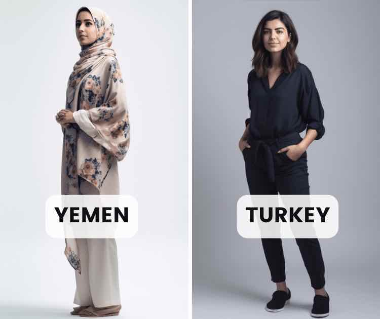 Les images générées montrent des femmes aux physiques harmonieux, avec de légères variations en fonction de leur pays d’origine. Il est intéressant de noter que Midjourney semble privilégier un aspect naturel, la plupart des femmes apparaissant avec un maquillage et des bijoux discrets. À l’exception de quelques exemples de vêtements traditionnels, tels que le sari porté par la femme indienne, toutes les femmes sont représentées avec un pantalon.